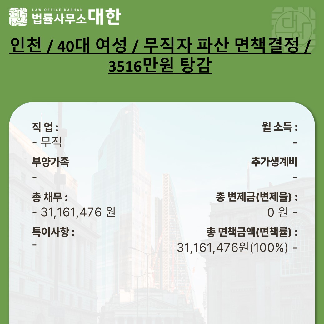 인천 / 40대 여성 / 무직자 파산 면책결정 / 3516만원 탕감