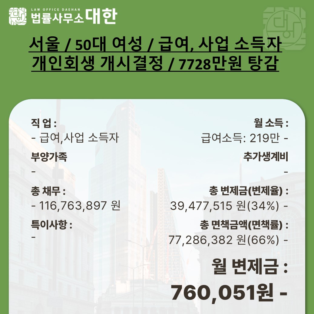 서울 / 50대 여성 / 급여, 사업소득자 개인회생 개시결정 / 7728만원 탕감