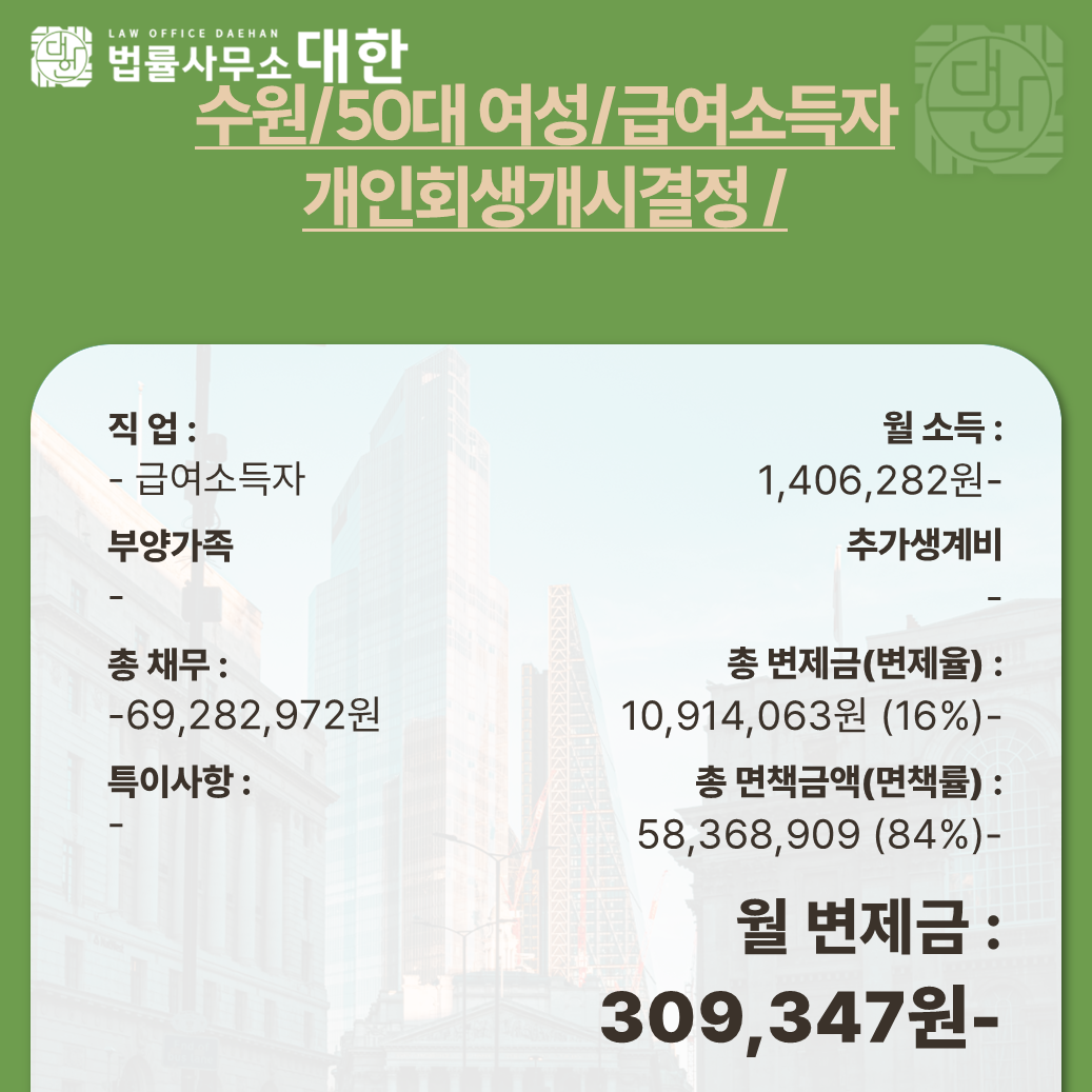수원 / 50대 여성 / 급여소득자 / 대인회생개시결정 / 5,836만 원 탕감