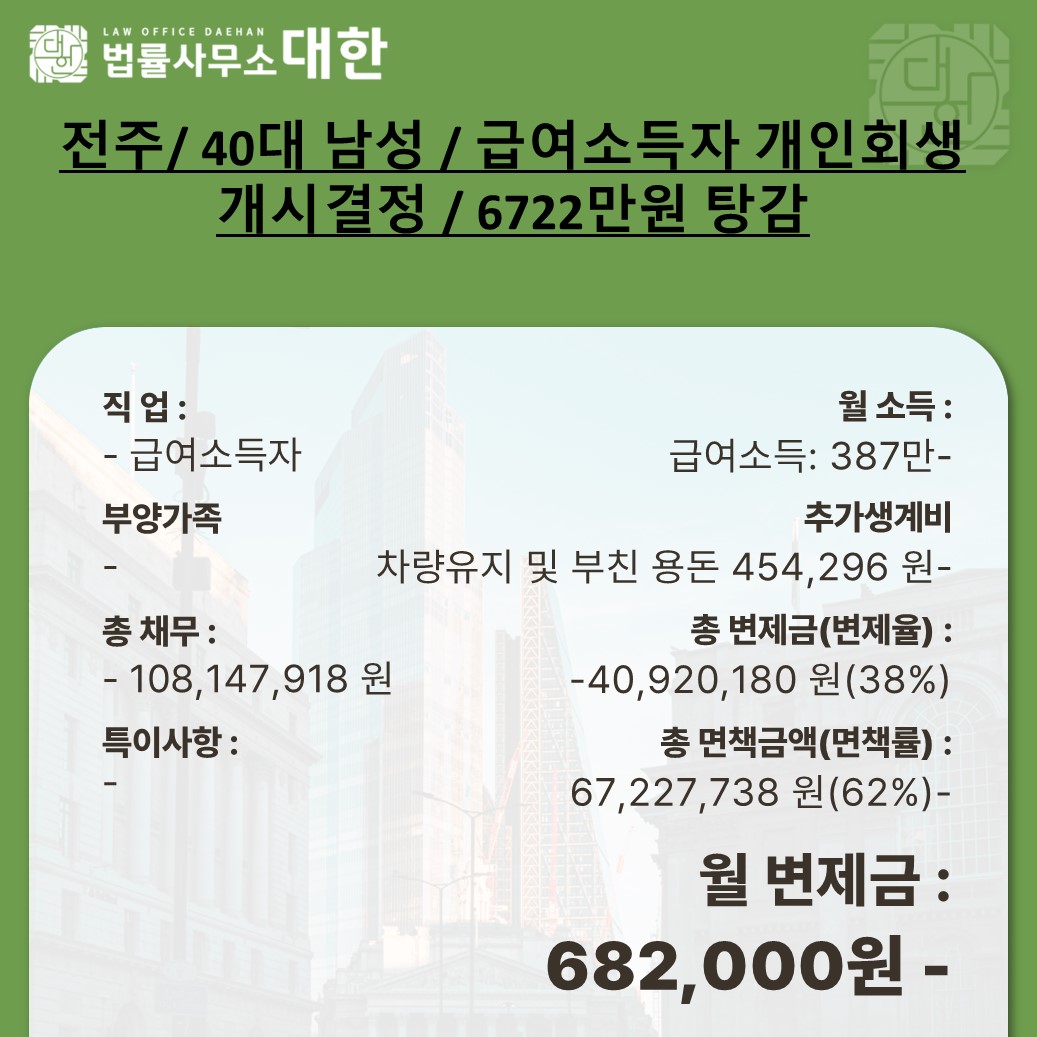 전주 / 40대 남성 / 급여소득자 개인회생 개시결정 / 6722만원 탕감