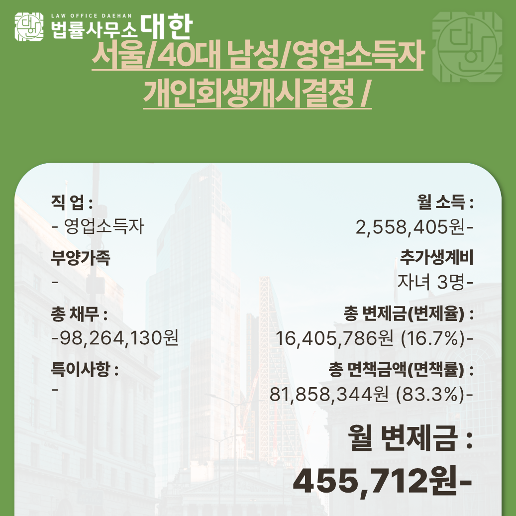 서울 / 40대 남성 / 영업소득자 / 개인회생개시결정 / 8,185만 원 탕감