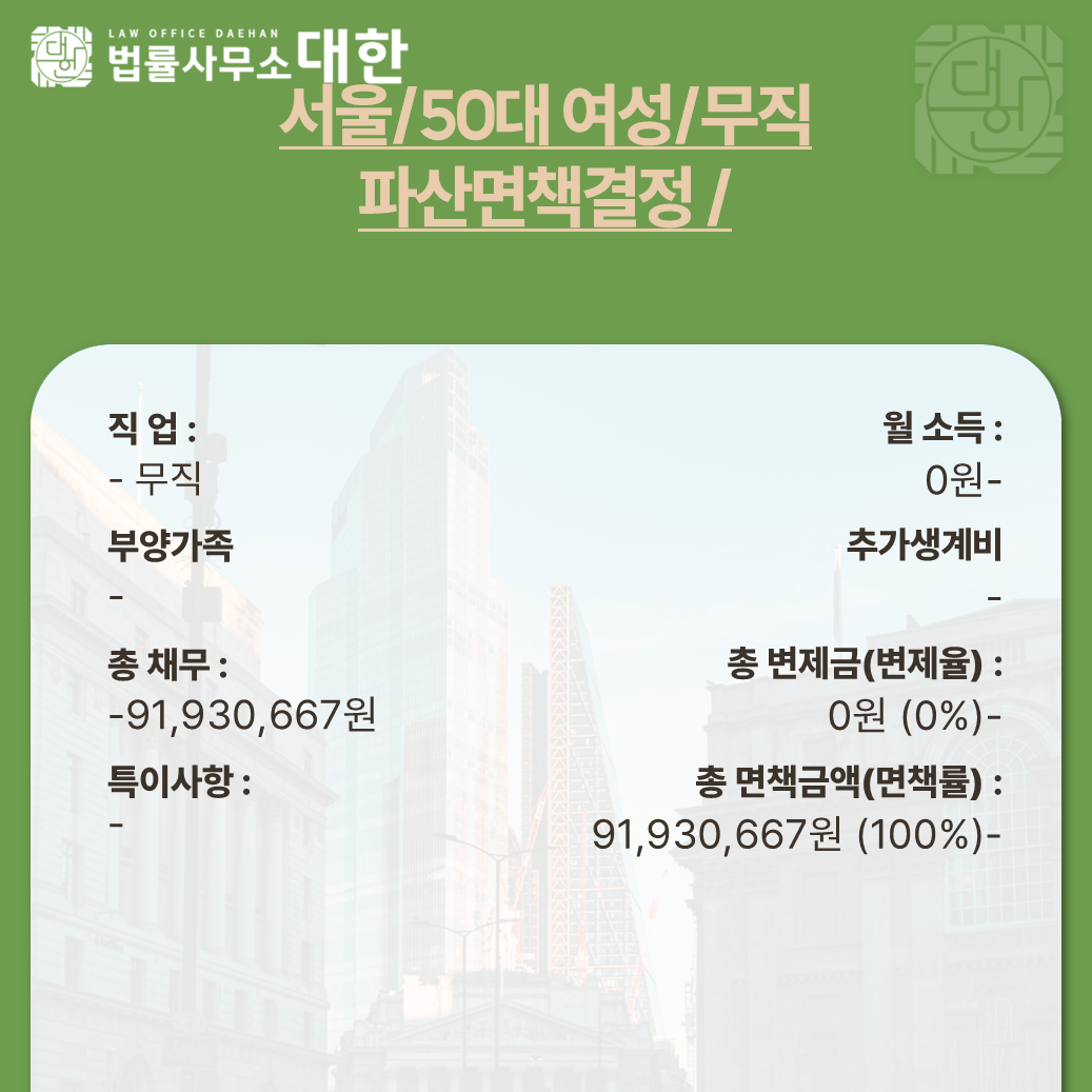 서울 / 50대 여성 / 무직 / 파산면책결정 / 9,193만 원 탕감
