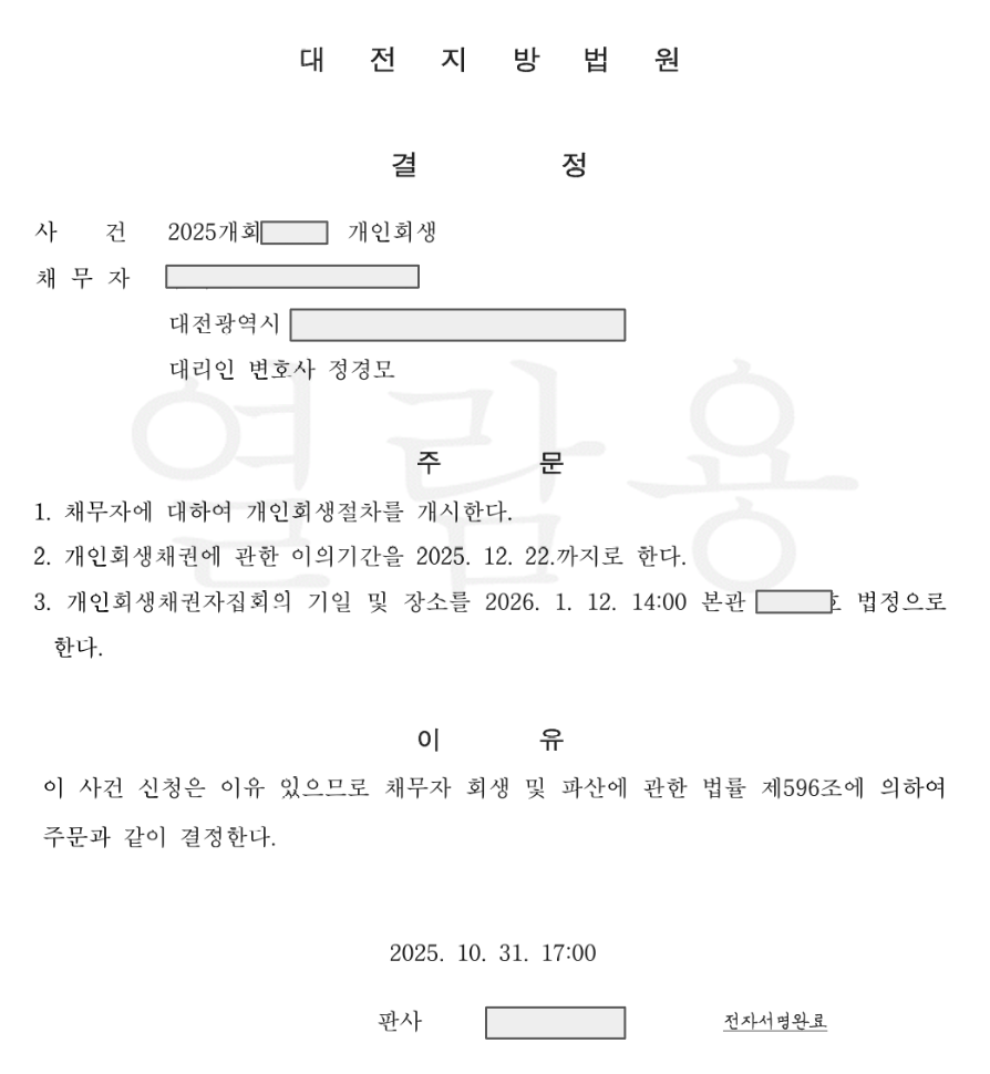자영업자 특성상 수입이 일정치 않았으나 매입 및 매출의 소명을 잘 마치어 변제율 15%로 개인회생 개시결정을 받았습니다.