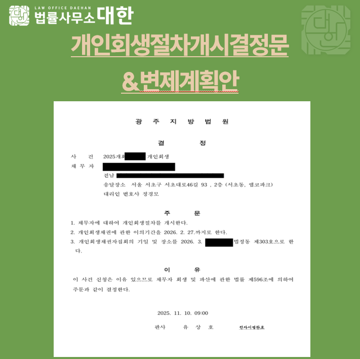 • 다음글 대구 / 30대 남성 / 급여소득자 개인회생 개시결정 / 8564만원 탕감