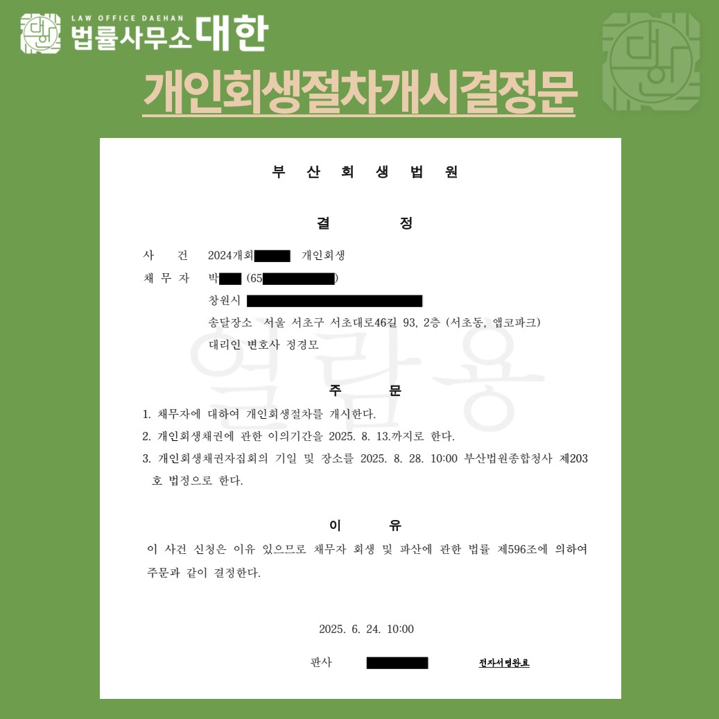 • 이전글 부산 / 60대 남성 / 영업소득자 / 개인회생 개시결정 / 646만원 탕감