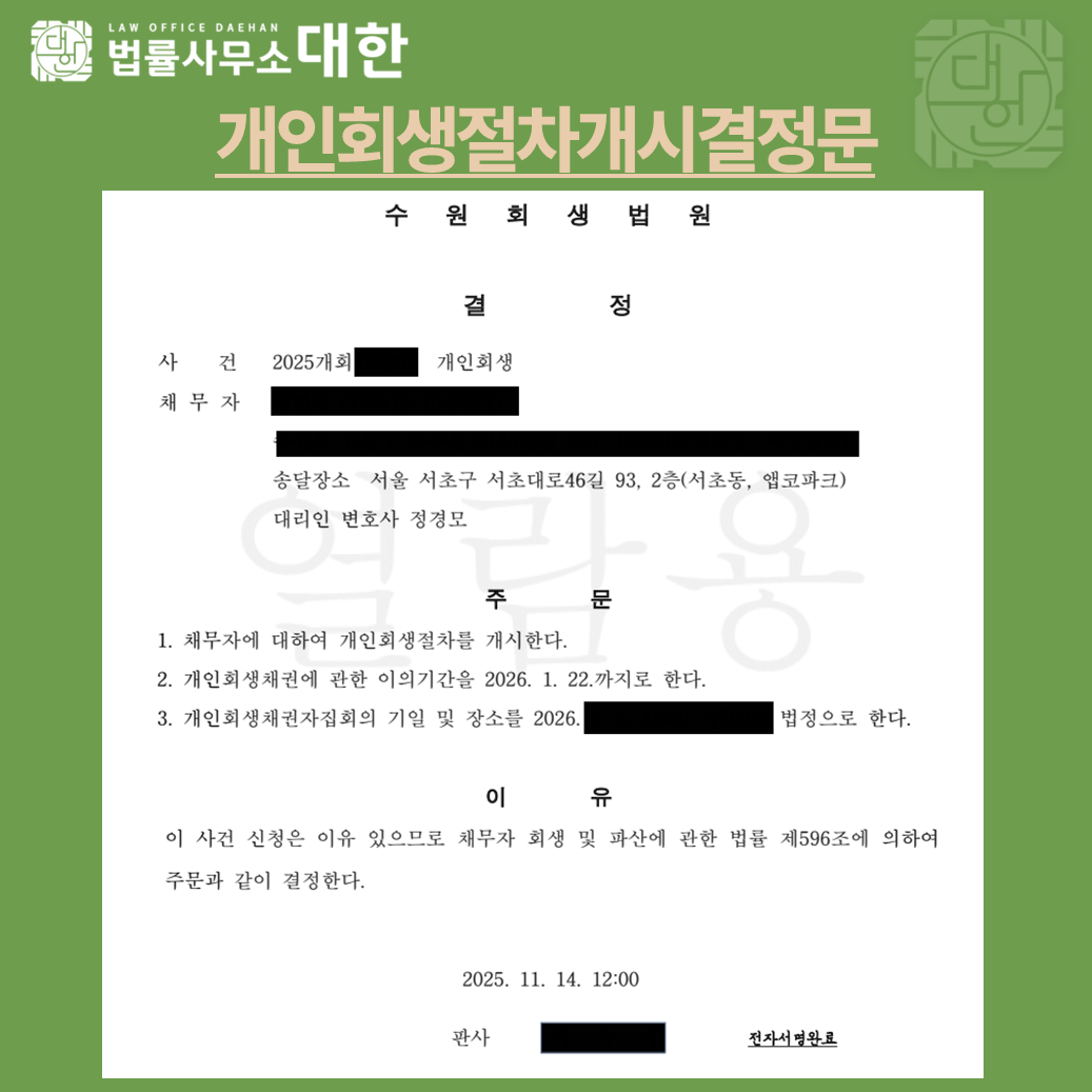 자영업을 하다가 코로나로 사업장이 힘들어지게 되어 개인회생을 신청하였고, 1차 보정권고 후 바로 개시결정을 받았습니다.