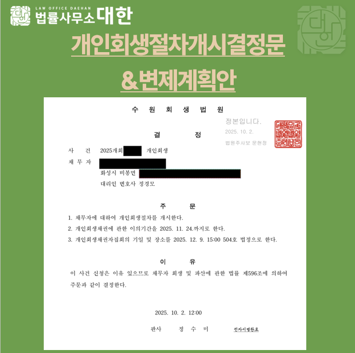 • 다음글 대구 / 30대 남성 / 급여소득자 / 개인회생 개시결정 / 원금 58%탕감