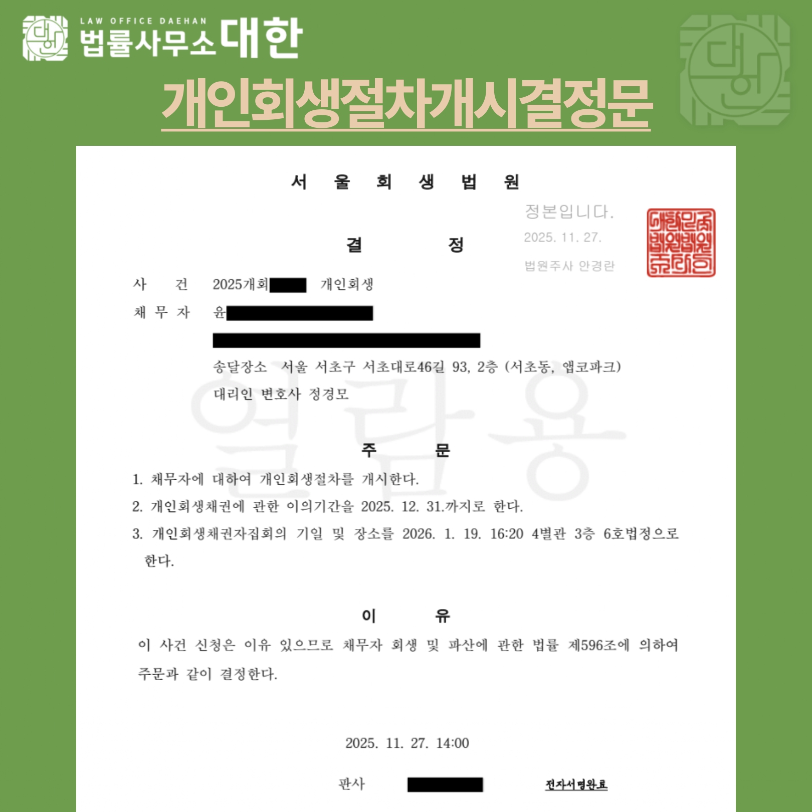 서울 / 50대 남성 / 급여소득자 / 개인회생 개시결정 / 7,587만원(73%) 탕감