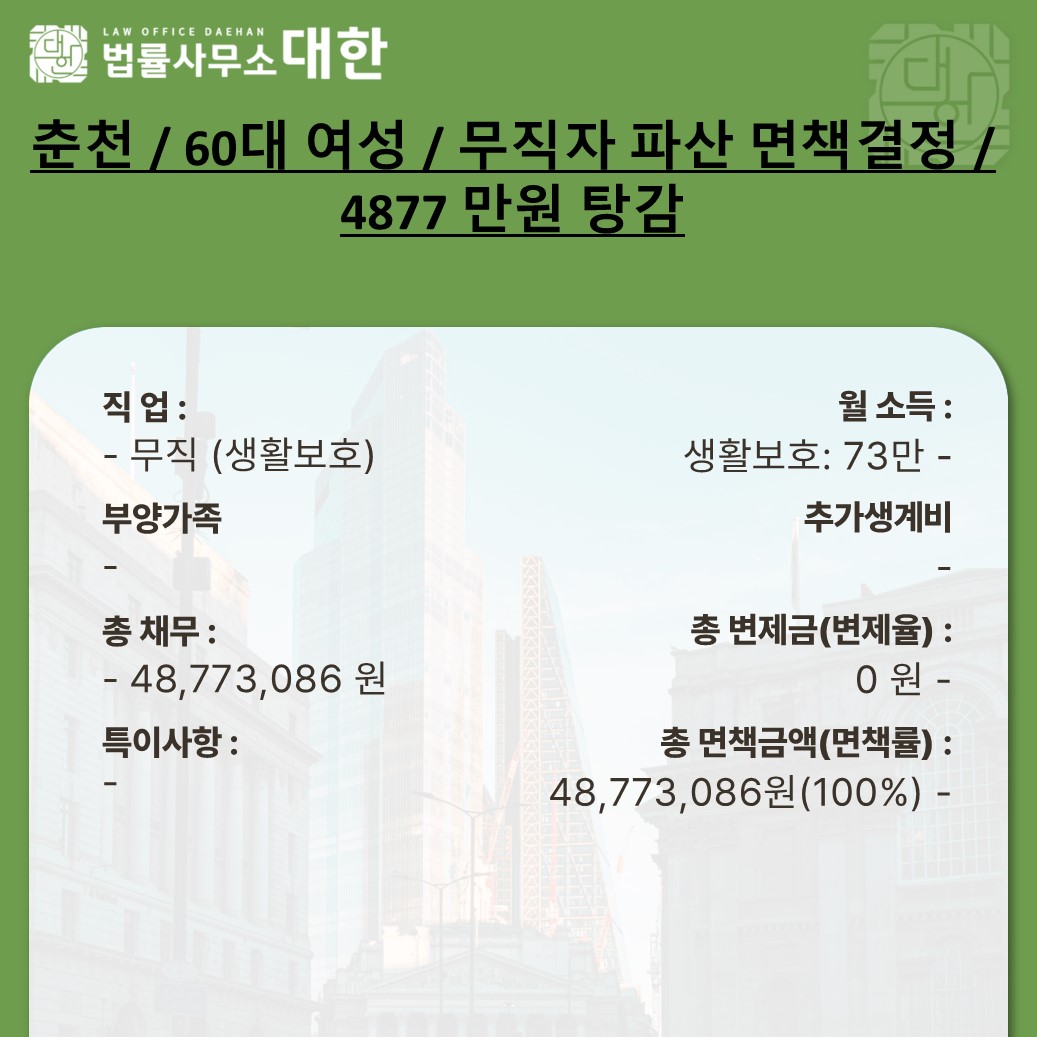 춘천 / 60대 여성 / 무직자 파산 면책결정 / 4877 만원 탕감