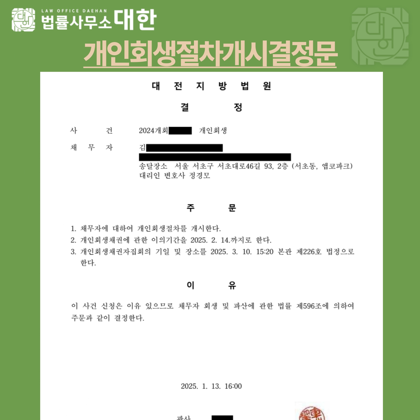 대전 / 30대 남성 / 영업소득자 / 개인회생 개시결정 / 2억 6,354만원 탕감