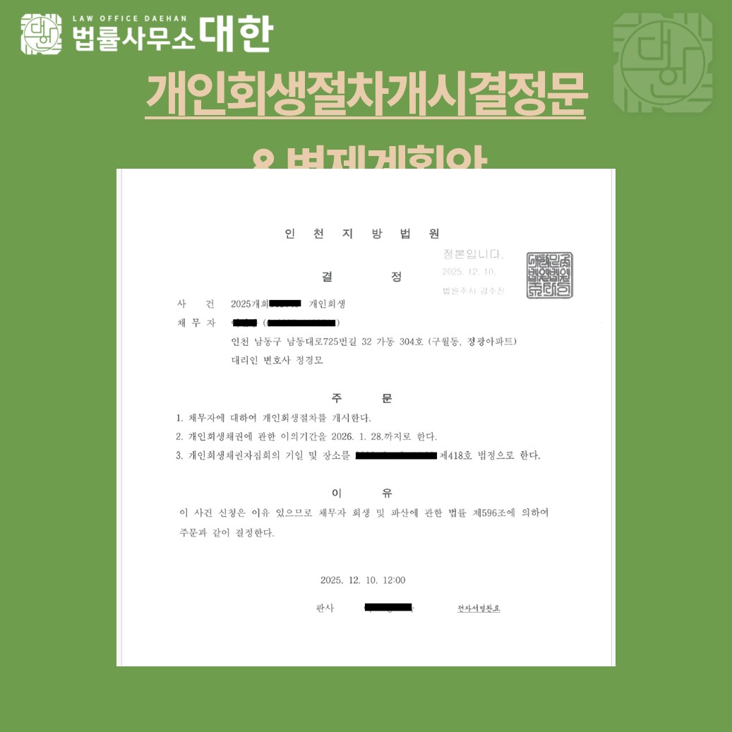 인천 / 60대 남성 / 영업소득자 개인회생 개시결정 / 4596만원 탕감
